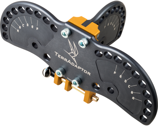 The main load bearing attachment point on the TerrAdaptor is a two position yoke located at the bottom of the main head. Items are attached to the head with the use of the Main Attachment Pin, which is a quick release ball lock pin.