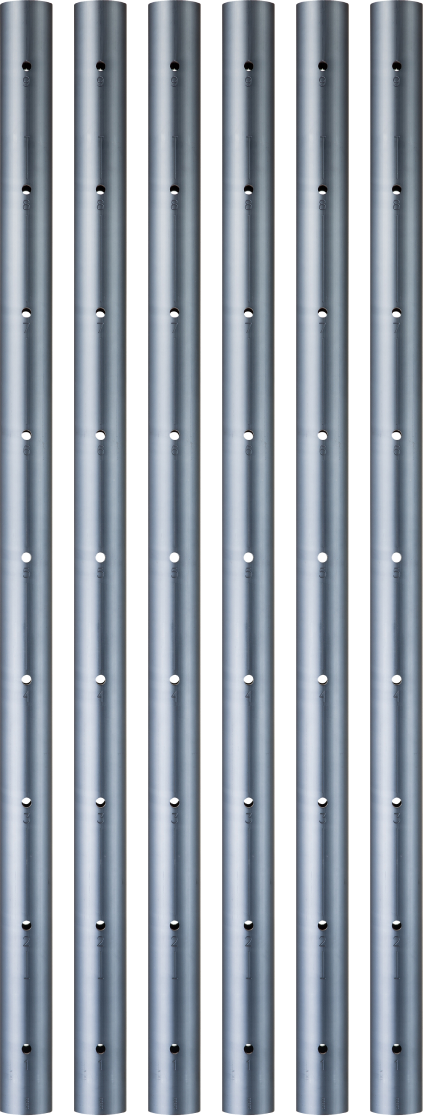 The height of the TerrAdaptor is easily adjusted by means of telescoping leg sections. Adjustment holes in small diameter leg sections (referred to as Perf Tubes) are labeled 1 through 9 and adjustment holes for the larger diameter mid section tubes (Mid Tubes) are labeled X and Y. Leg connections and connections to various accessories are made by sliding the small diameter perf tube into the large diameter mid tube or other components and securing the connection with a Leg Coupling Pin. Leg coupling pins provide a secure connection when the pin is fully inserted and the bail is properly secured.